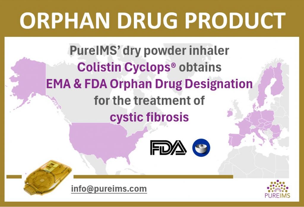 EMA as well as FDA recently designated PureIMS’s colistin dry powder inhaler ‘Colistin Cyclops®’ orphan drug product for the treatment of cystic fibrosis.